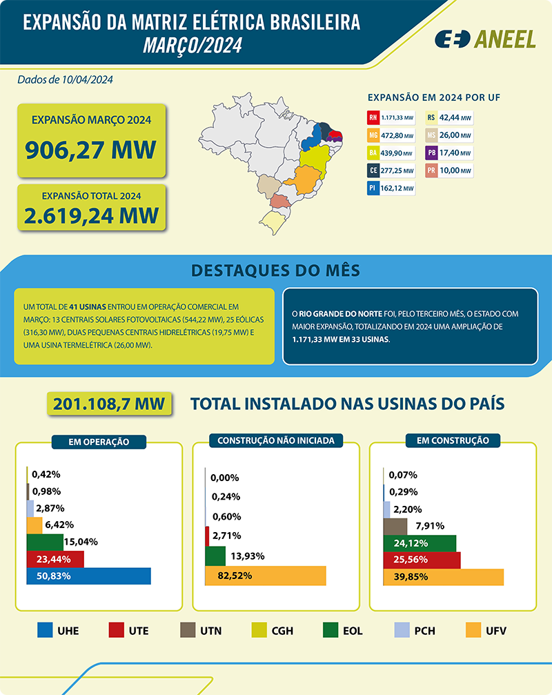 Os primeiros três meses de 2024 já demonstram que, a exemplo de 2023, este será um ano de grande avanço para a matriz elétrica brasileira. Segundo dados da Agência Nacional de Energia Elétrica (ANEEL), o país concluiu o primeiro trimestre com 105 novas usinas e um incremento de 2,6 gigawatts (GW) na potência instalada. Desse total, o mês de março respondeu por um aumento de 906 megawatts (MW) e a entrada em operação de 41 usinas.